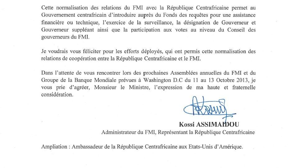 Je tiens à préciser que cette mission a été salutaire pour mon pays. La République Centrafricaine attire maintenant l’attention de la Communauté internationale. Les différents plaidoyers viennent de nous donner un signal fort. Le Fonds Monétaire International (FMI) reprend sa coopération avec la République Centrafricaine. La Mission Résidente de la Banque mondiale reprend ses activités et promet la restructuration de certains portefeuilles de projet et le décaissement sur les portefeuilles des projets suspendus provisoirement.