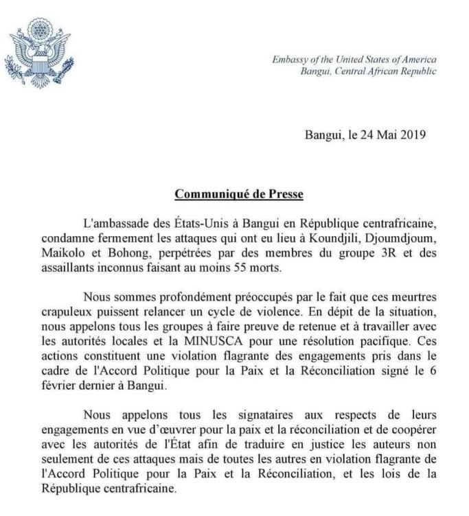 Par exemple, la signature en mai 2018, sous l'impulsion de la Mission des Nations unies pour la Centrafrique (Minusca), d'un accord de non agression entre les anti-balaka et les déplacés.