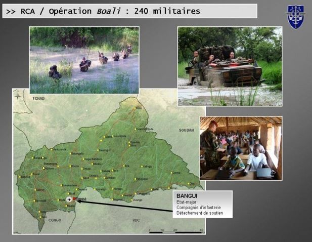 «La France est présente dans le cadre de l’opération Boali en RCA depuis 2002», dit le site du ministère français de la Défense. « Cette opération vise à apporter un soutien logistique, administratif, technique et si besoin opérationnel à la MICOPAX (Mission de consolidation de la paix en République Centrafricaine).»